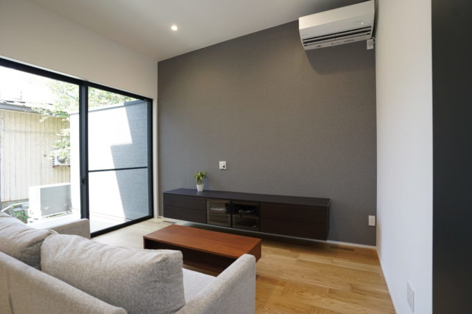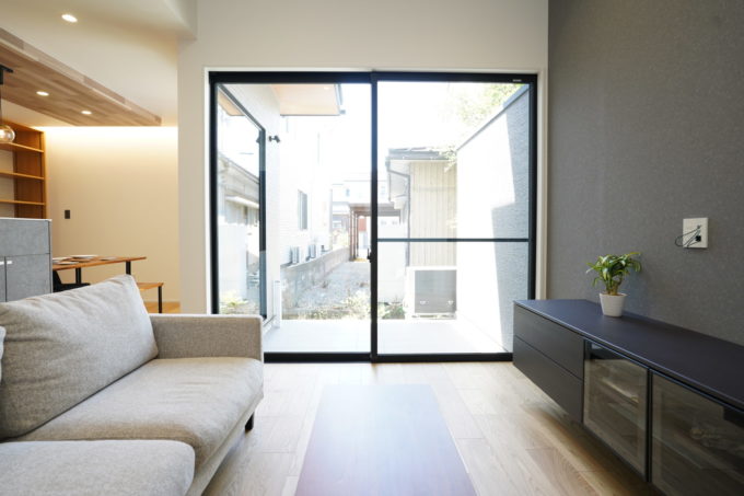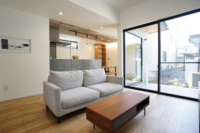リビングには勾配天井とお庭へと続く大開口の窓を採用した事で、実際の広さ以上に開放的な空間を叶えます。