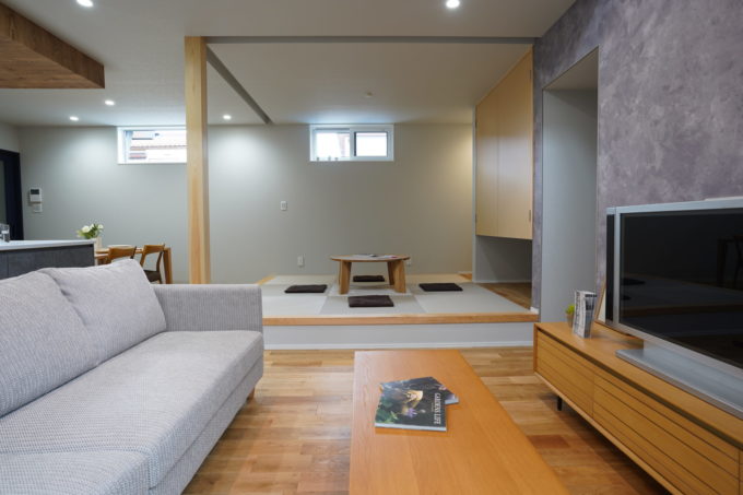 LDK の一角に設けた小上がりの畳コーナーはホッと一息、くつろぎの時間を過ごすことができます。