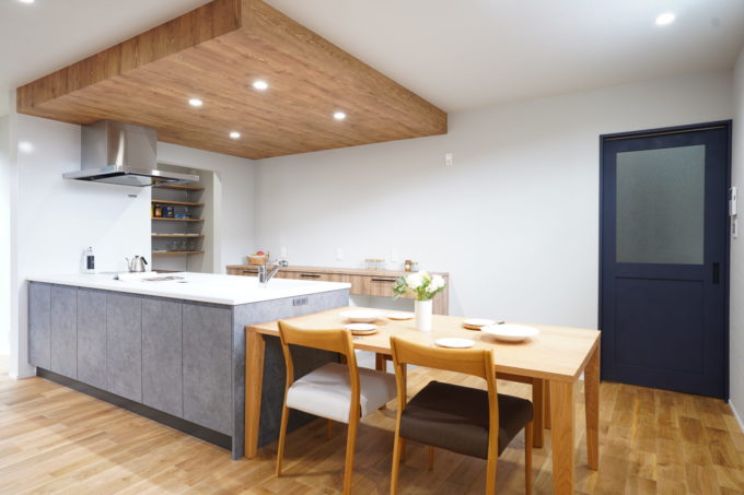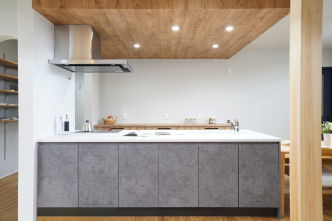 リビングとの一体感を保ちながらも独立した空間を確保できる、オシャレな下がり天井を採用したキッチン。
