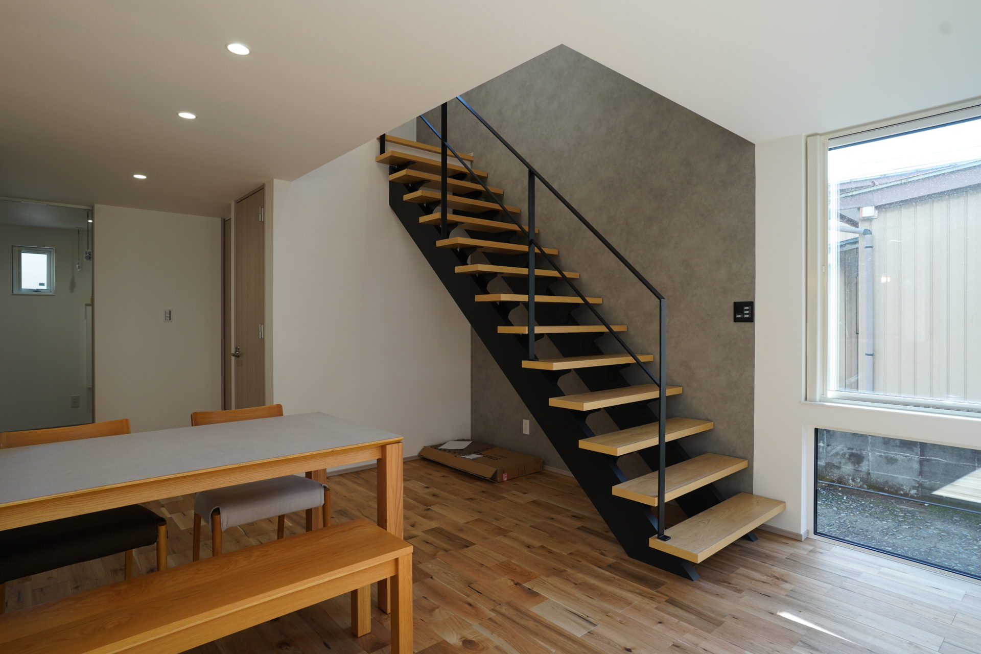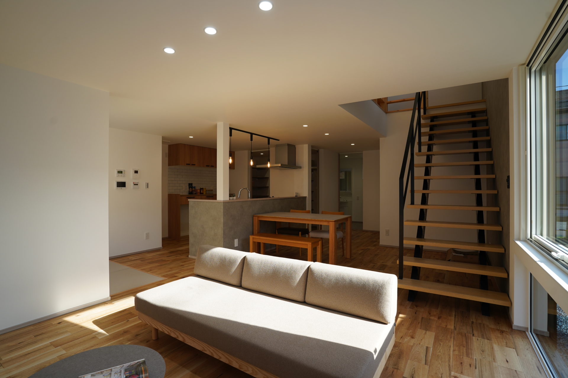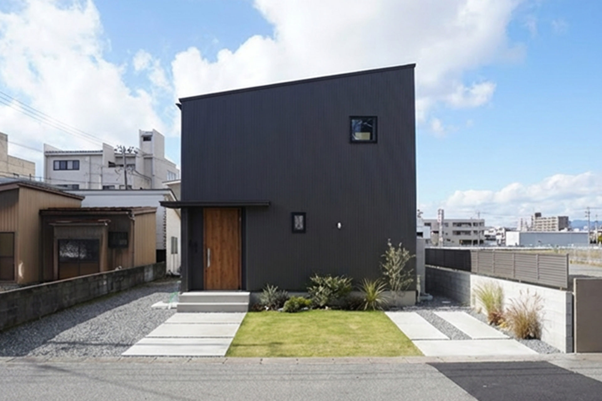 のガルバリウムに芝生の緑が映える、モダンで洗練された外観。一歩中へ入れば、そこには「家族のつながり」をデザインした開放感あふれる空間が広がっています。